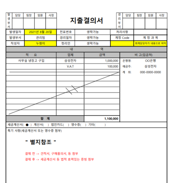 - 지출결의서에는 지출 금액, 지출 목적이 명확하게 나와있어야 합니다.