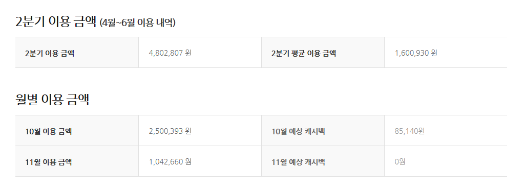 2분기 평균 이용금액은 160만원이었는데.. 10월엔 250만 원을 사용했네요ㅎㅎㅎㅎㅎㅎ.....