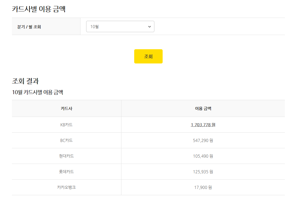 아래 카드사별 이용금액에서 10월을 선택하고 조회 누르면 각 카드사 별로 사용한 금액이 집계되어 있습니다. 캐시백 되는 금액에 놀라고 10월 이용금액에 놀라고 여러모로 놀랍습니다..! 소비를 줄일 거라고 만약 신청을 안 했더라면 8만 5천 원은 날아갔겠네요.. 아찔합니다.