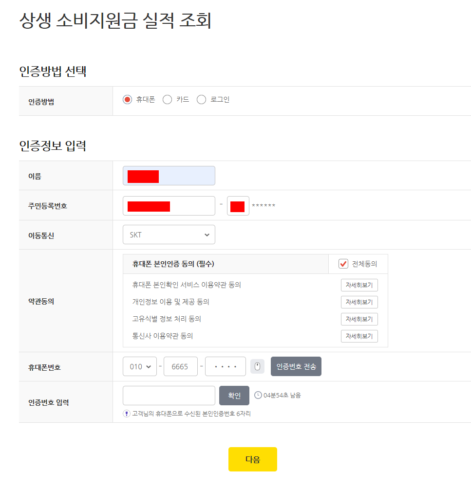 인증 방법을 선택해 주시면 되는데 저는 휴대폰이 간편하여 휴대폰으로 해봤습니다. 비워져 있는 정보들을 채워 넣고 인증번호 전송을 누르면 휴대폰의 문자 인증번호를 입력해줍니다. 그리고 확인 -> 다음