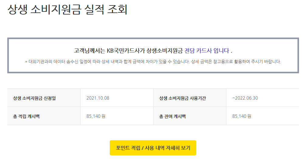9월 말 상생소비지원금 제도가 실시된다고 했던 것이 벌써 2개월이 다 되어 갑니다. 시간이 참 빠르죠~? 저 같은 경우는 2분기 지출금액이 상당해서 상생소비지원금이 별 소용없겠다 생각하면서 신청만 해놨습니다. 10월에 소비를 많이 할 생각이 없었기 때문이었죠! 그렇게 시간이 지났고 이제 각 카드사마다 10월 이용금액이 집계가 되었더라구요~ 저는 국민으로 신청했는데 잊고 지내다 조회를 해봤습니다. 과연 얼마의 상생소비지원금이 발생했을까요?